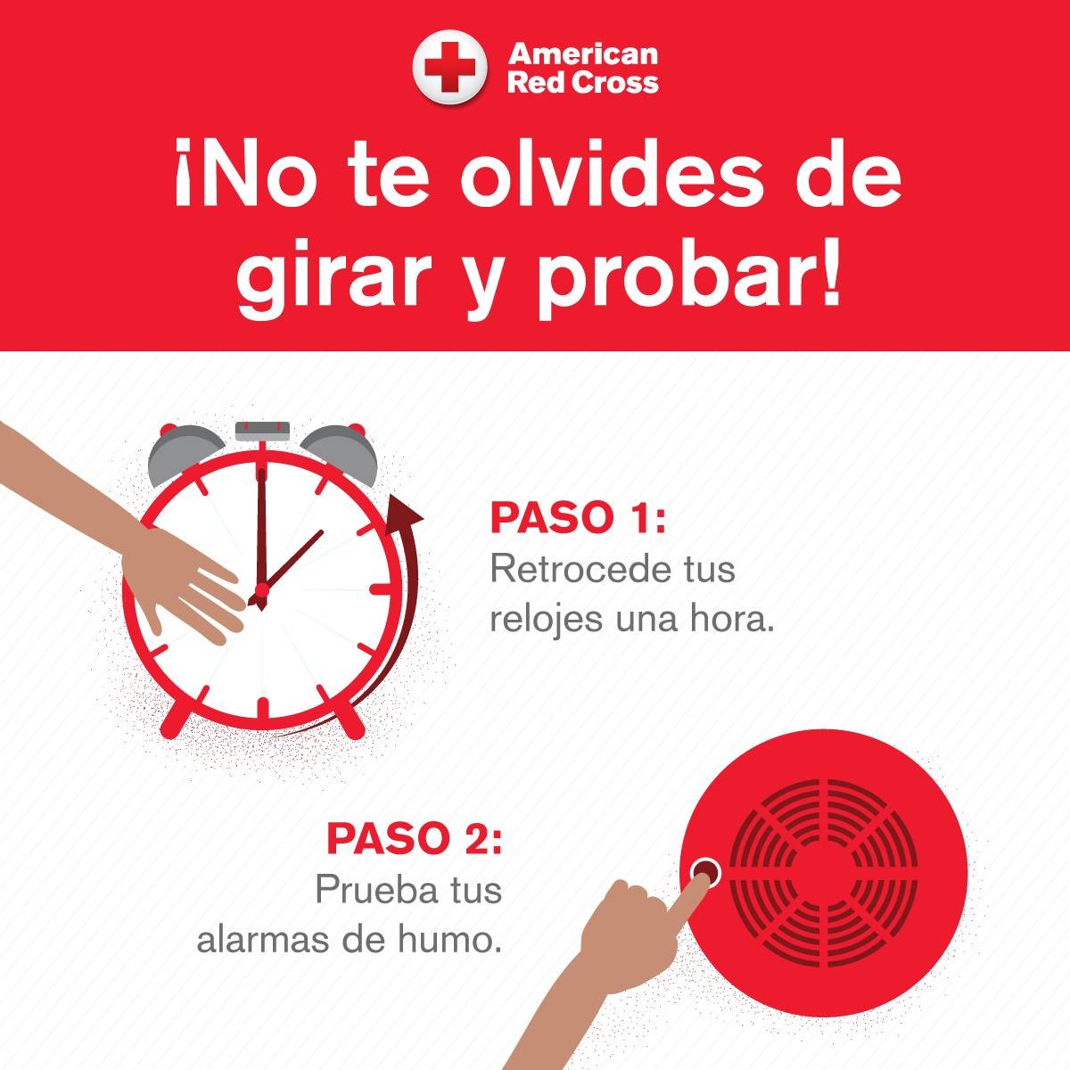 Mientras las personas retroceden sus relojes este fin de semana para dar fin al horario de verano, la Cruz Roja Americana pide a todos que también prueben sus alarmas de humo.