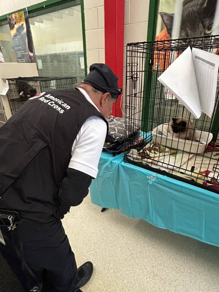 Marcel Pajuelo-Schwartz has been a volunteer with the Red Cros since 1967 and serves as a disaster pet liaison. His mission is to reconnect these dogs, cats, and other animals with their families after a disaster. “The animals have been through a lot,” Marcel said. “A lot of them, after experiencing something like this, go into depression and become reclusive. So, you have to talk to them and try and destress them.”