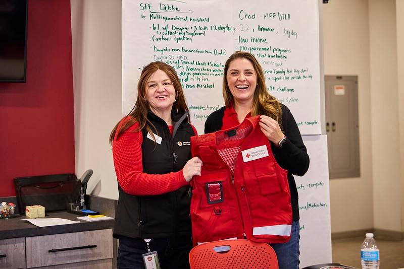Amanda Morita, interim regional disaster officer (left), and Jacquie Clites, regional chief executive officer (right), share a moment while giving Jacquie a new disaster response vest during the response and recovery summit.