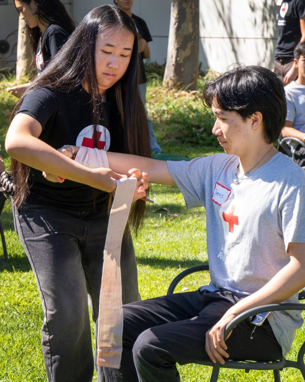 During a READYteens hands-on drill, a trainee practices splinting Bi's arm—a moment he sees as essential to building confidence through practice.