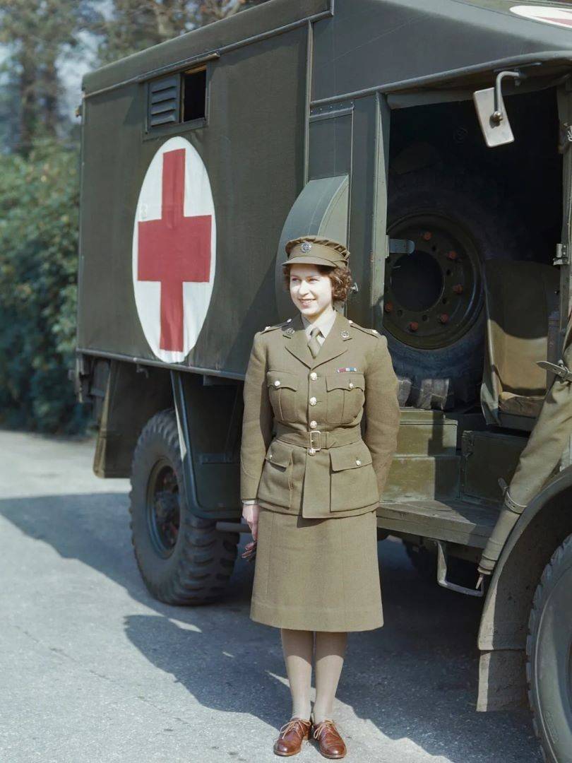 Queen Elizabeth II in Auxiliary Territorial Service uniform in front of a Red Cross ambulance, April 1945