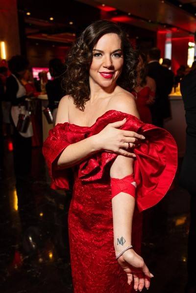 In full glam, a Gala-ready Amy Dornbusch proudly displays her blood donation before heading to the 30th Anniversary Red Cross Gala.