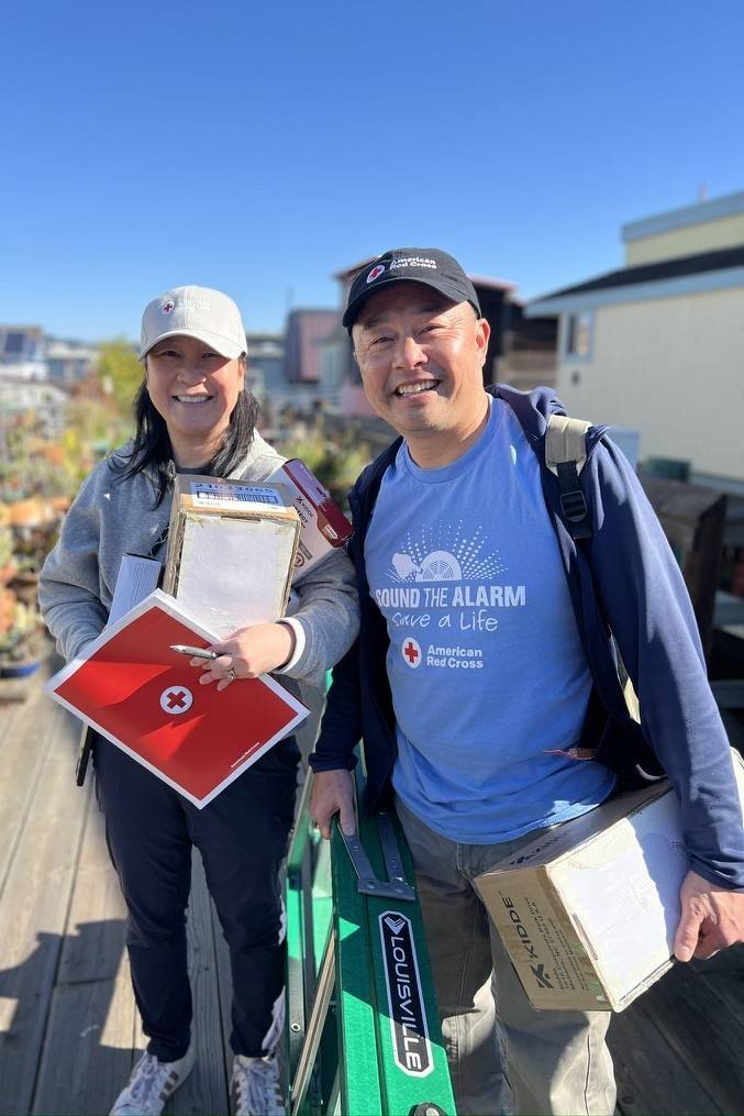 Red Cross Volunteers Catherine Lee and Ron Lau prepare to install smoke alarms in Sausalito floating homes