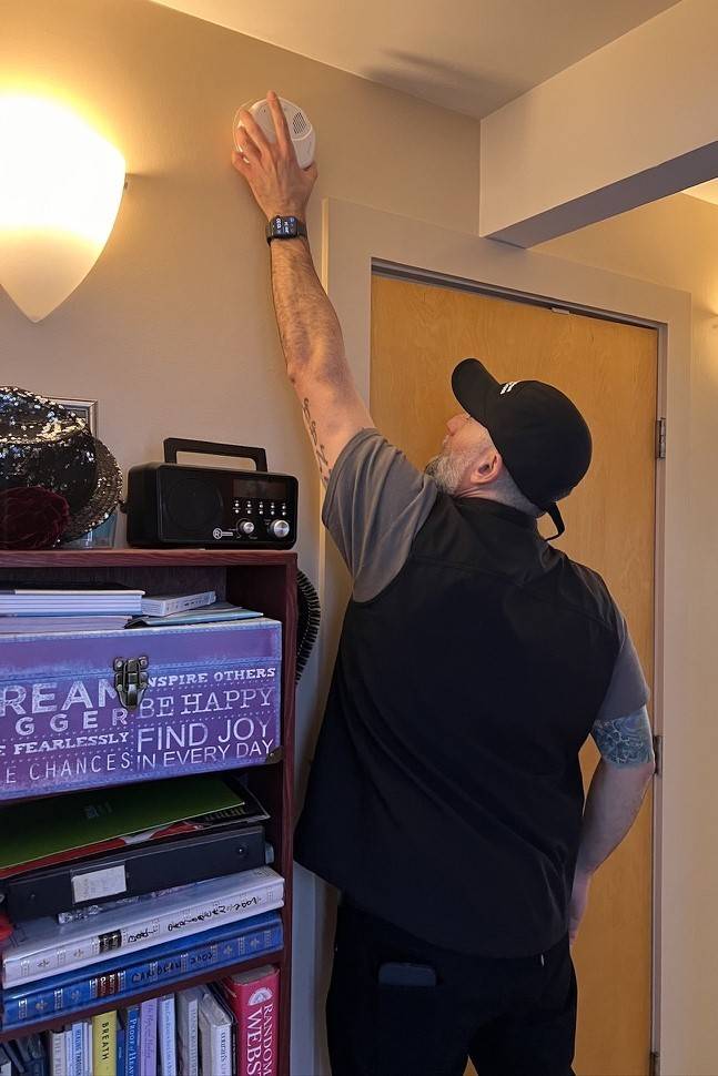 Vincent Valenzuela installs smoke alarm in a Sausalito floating home
