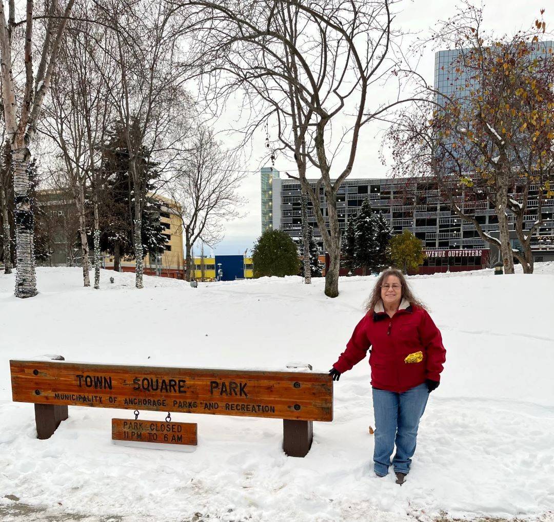 Jodi in front of the Anchorage Town Square Park