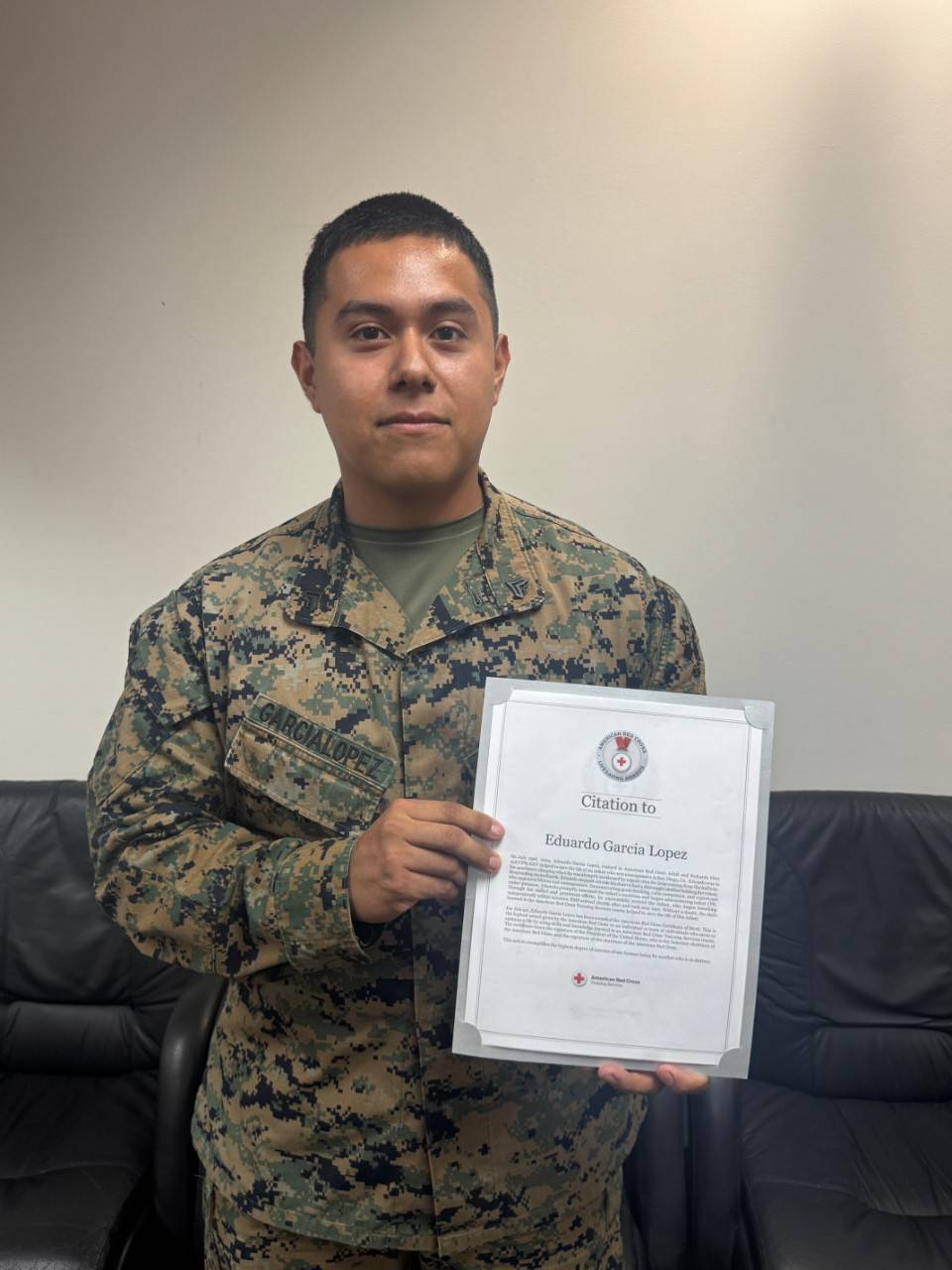 The American Red Cross has awarded Marine Corporal Eduardo Garcia Lopez the prestigious Lifesaving Award Certificate of Merit, the organization’s highest honor for individuals who use Red Cross training to save or sustain a life. Corporal Garcia Lopez earned this recognition for his extraordinary courage and decisive action during a life-threatening emergency on the night of July 23, 2024.