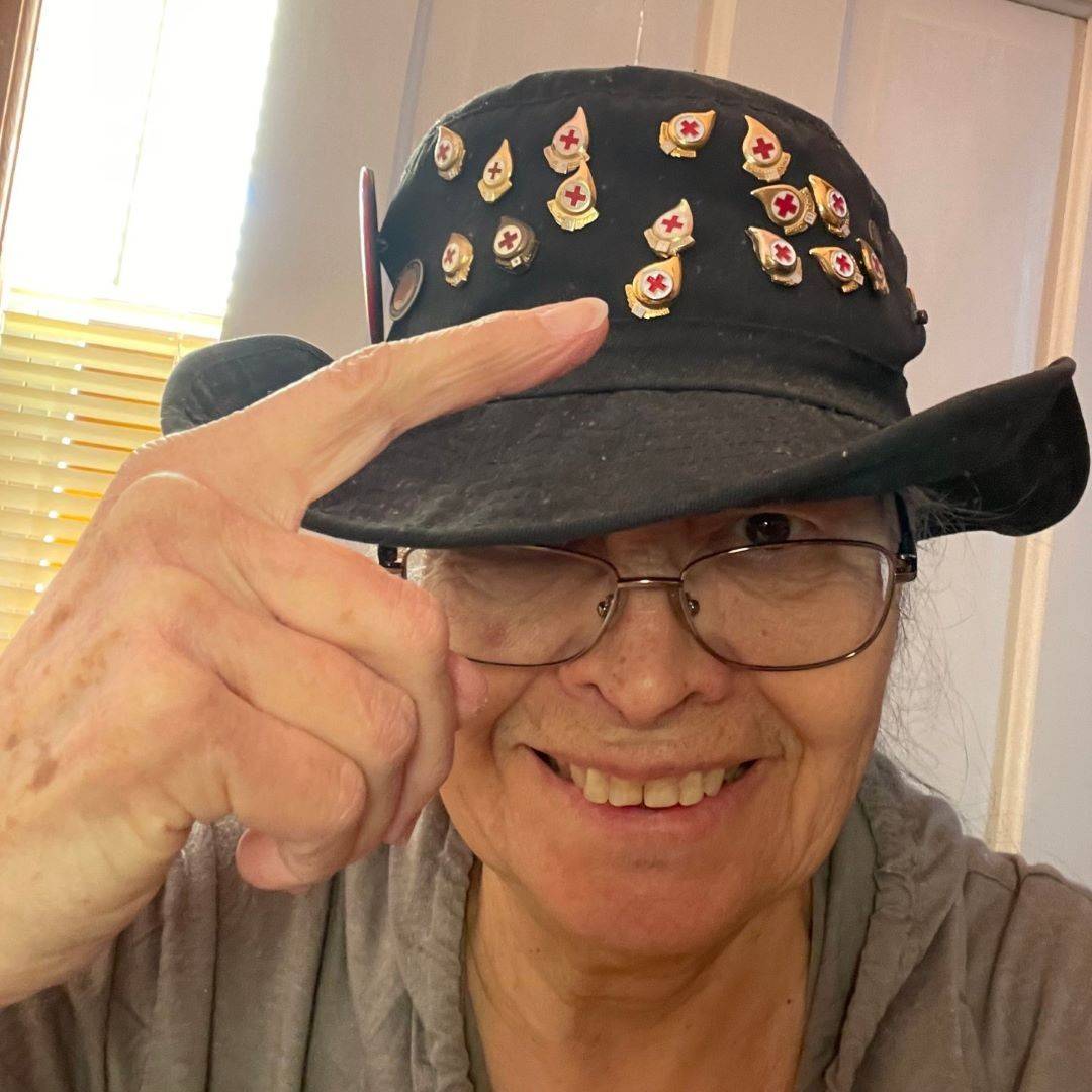 A PIN FOR EVERY PINT Andrea proudly wears the legacy of her donations—literally. A floppy hat adorned with Red Cross pins marks each milestone. Each pin isn’t just a token—it’s a story of hope, healing, and humanity.