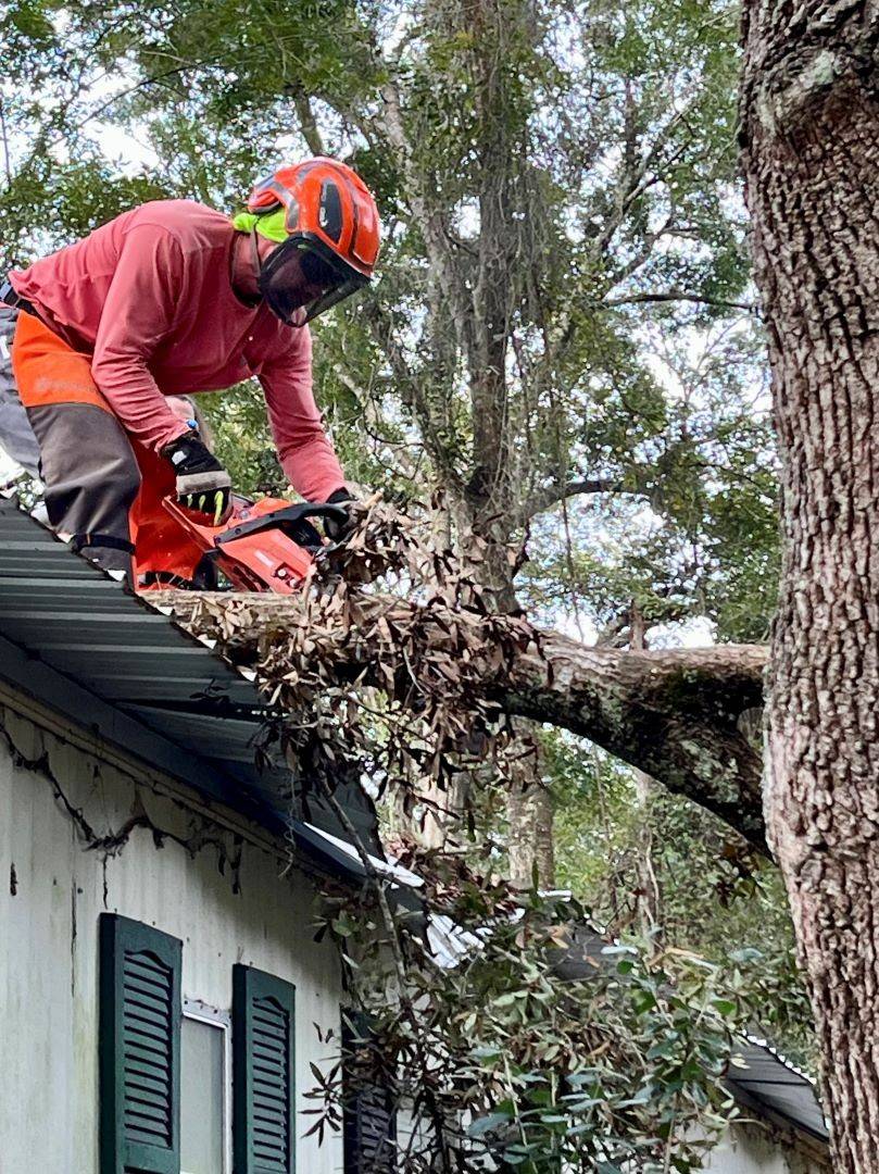 But this situation needed something more. The heavy red oak limb was still perched precariously on the roof, threatening to cause more damage or even collapse. The homeowner didn’t have the resources — or the strength — to remove it herself.