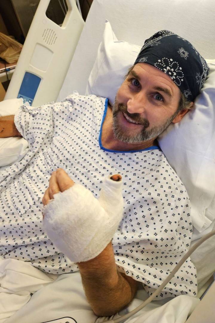 “I was bleeding pretty heavily. I had actually plugged it myself. I had my hand in the wound and had just gotten my thumb into the right position, squeezing it,” he explained. “When I finally got to the hospital, I was probably down three-and-a-half to four pints at that point. They were like, ‘He needs blood now.’”