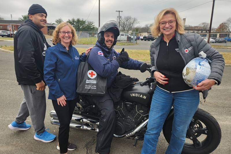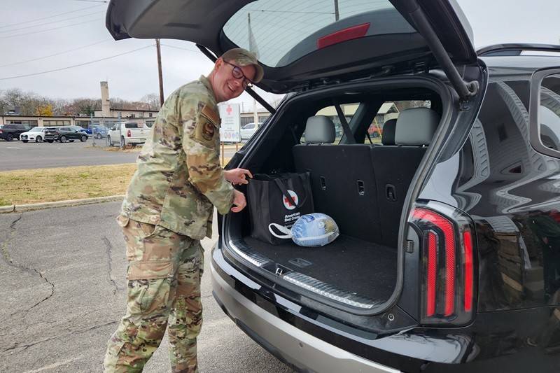 Red Cross volunteers were joined by military members stationed at Joint Base Maguire-Dix-Lakehurst who helped load cars – and a motorcycle rider – with frozen turkeys and bags of food as they drove up to the Red Cross house.