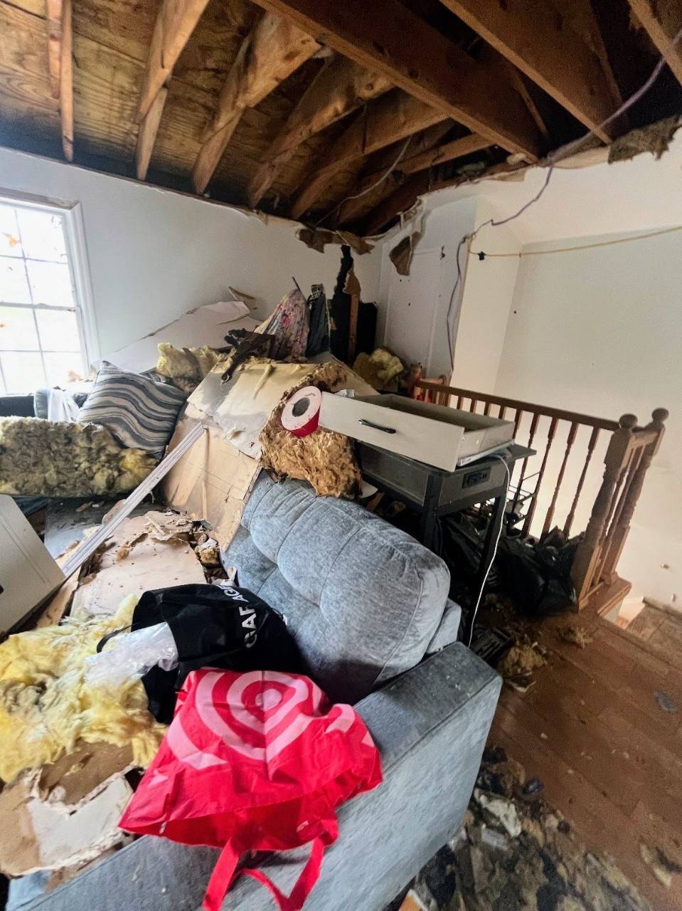 Burned materials and soggy insulation fill the living room of the Perales-Graveley home in the Bronx.