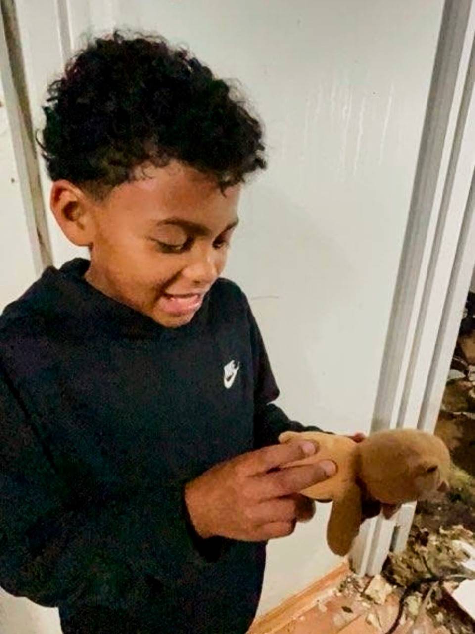 A boy reunites with his stuffed animal after it was recovered from the Perales-Graveley home fire.