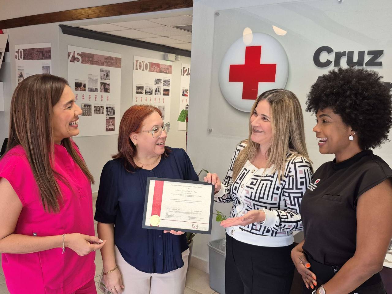 De izquierda a derecha: la Dra. Maribel García Colón, directora médica; Ada Díaz, gerente de Calidad FACT y consultora de Regulaciones; Margarita Gil de Rubio, supervisora del Laboratorio de Células Madre; y Yanira De León, directora del Departamento de Enfermería junto al certificado de la acreditación FACT otorgado a la Cruz Roja Americana en Puerto Rico.