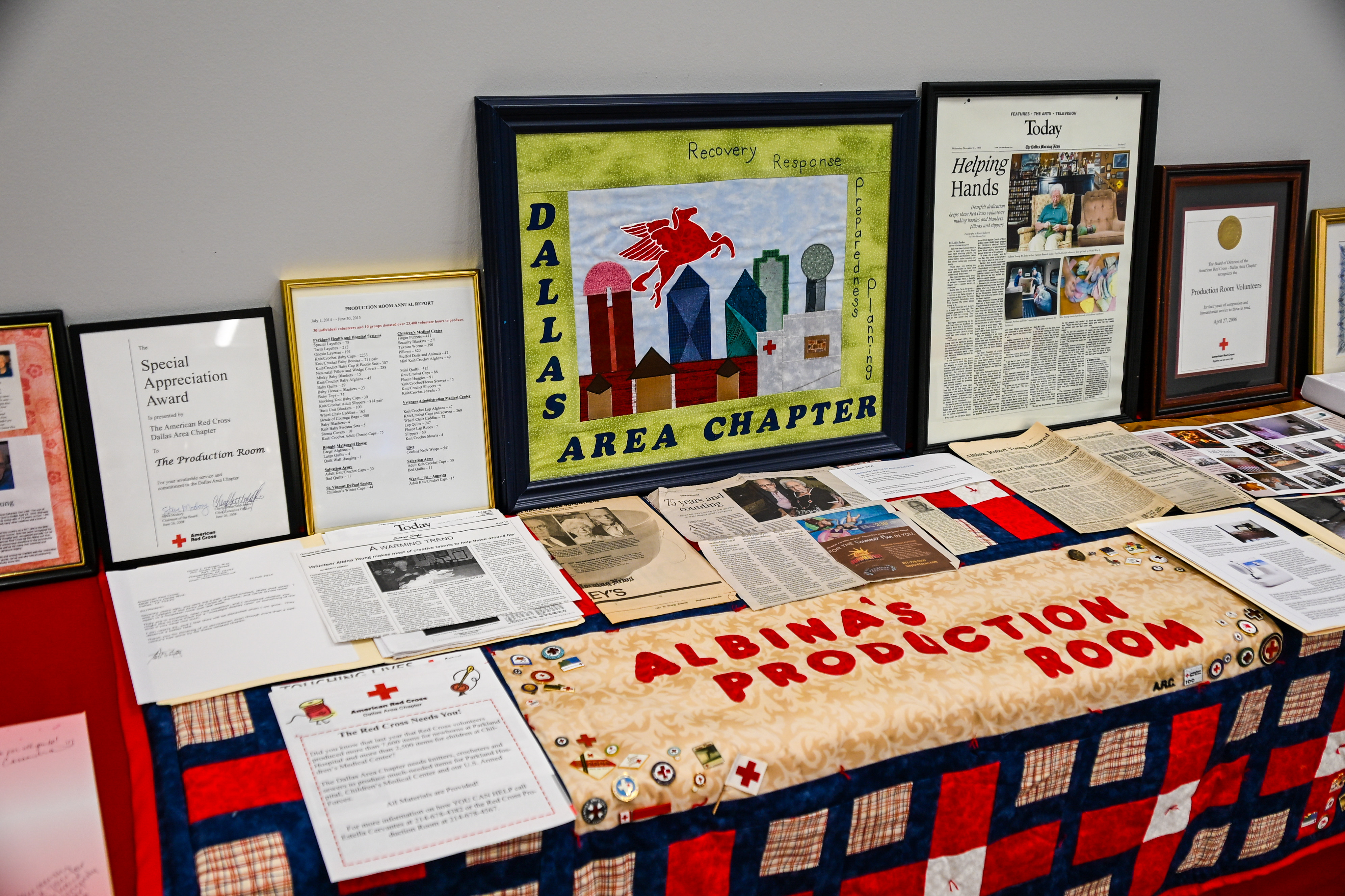 Thirty years ago, Marcia Bauer was aware of the American Red Cross but had no idea how she would spend so many years volunteering for them. In 1996, her husband James came across a full-page article in the Dallas Morning News that Albina Young, the dedicated and active leader of the Production Room Ladies, was retiring.