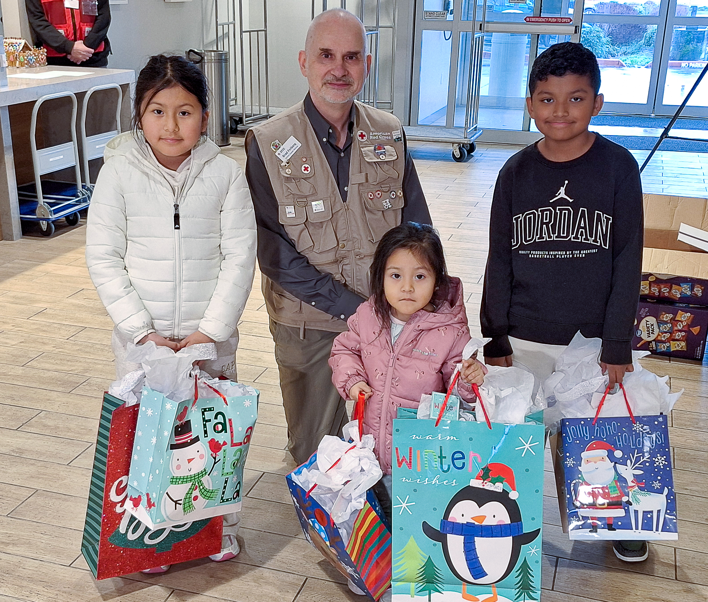 Red Cross volunteer Brad Feilberg delivers gifts to Yaritza, 7, her sister Emily, 5, and Cesar, 10, after their families were displaced by flooding in Auburn, Wash. Volunteers worked across several shelters to ensure these children affected by the disaster still felt the season's magic. (Photo by Elvia Alianiz/American Red Cross).