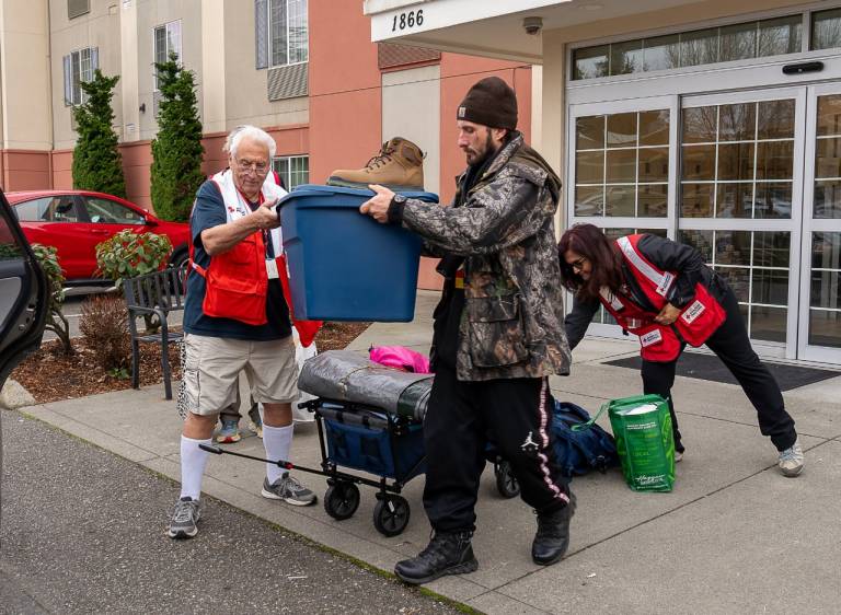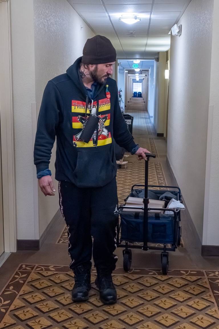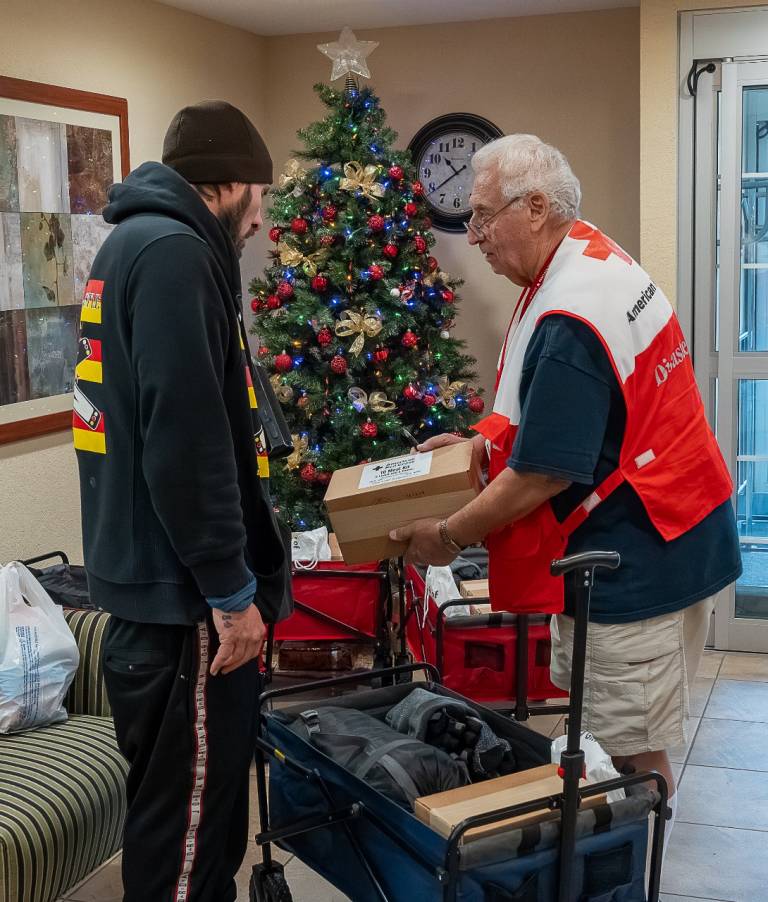 After spending Christmas in Red Cross care at the Candlewood Inn in Burlington, Joseph prepared to take his next steps. When he left, Red Cross shelter resident transition volunteers equipped him with resources to help him return to his pre-disaster status — including blankets, sleeping bag, tent, warm gloves, hat, socks, headlamp, 20 non-perishable meals and other essential resiliency supplies — all packed into a new, sturdy wagon he could easily bring with him.