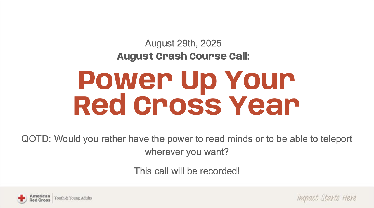 The Crash Course Calls discuss Red Cross related topics such as lines of service, history, etc. and connect youth to opportunities related to the discussed topics. Join the CCCs to learn more about the Red Cross and youth opportunities to engage in!
